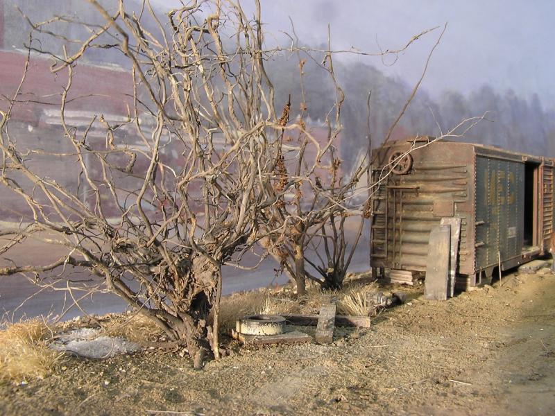 If your eye level is low - if you're viewing the layout or taking photos from baseboard level - then a distant wagon painted on the backscene [and assumed to be standing on the same ground level as your model wagon] would appear to be lower than the model because it is farther away. But if your eye level is high, in order for the painted wagon to appear farther away, you would need to paint it farther up the backscene. That's all well and good, but obviously wherever you decide to paint the wagon the backscene will only work from one eye level. From a different level it would look quite bizarre. If you have it set for track-level photos it will look weird from your operating position [unless of course your operating position is track level :lol:]
