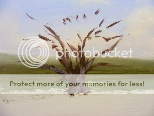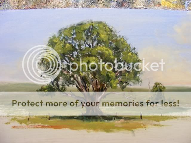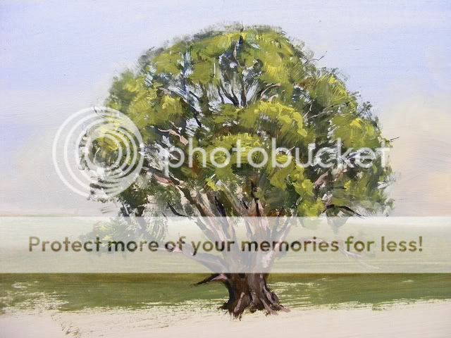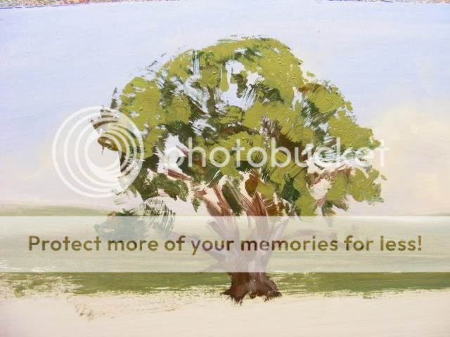The tree was then started with a half-inch wide flat brush. When working in oils or as in this case, acrylics, you start with the darks and work up to the lights. It's the reverse in watercolour - don't ask me why :lol: This doesn't mean you can't retouch the darks later on. In fact I did that same thing for this tree.