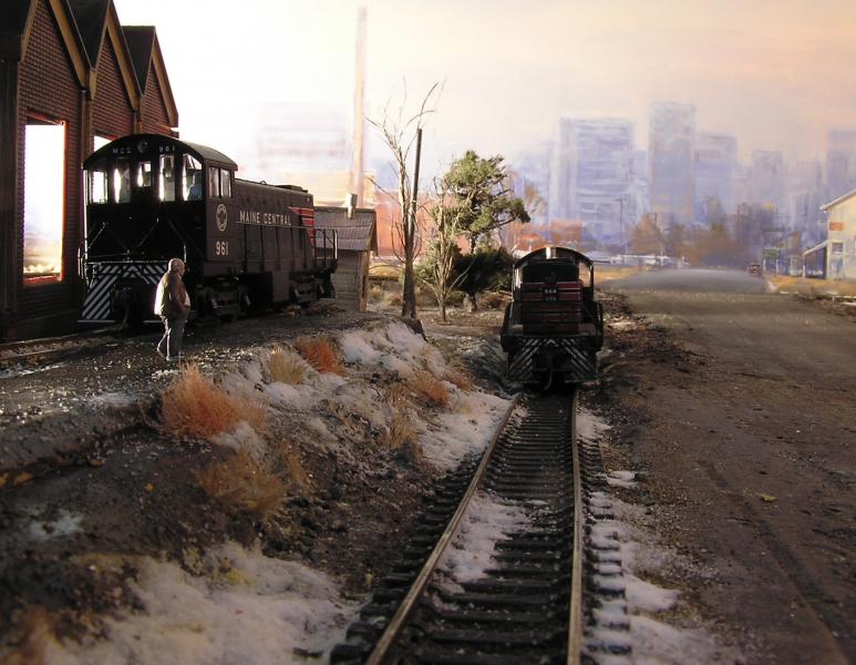 At the moment I just have a plain sky backscene.At the "station road" end how ever I tried an idea I picked up from an American model rail road web site.