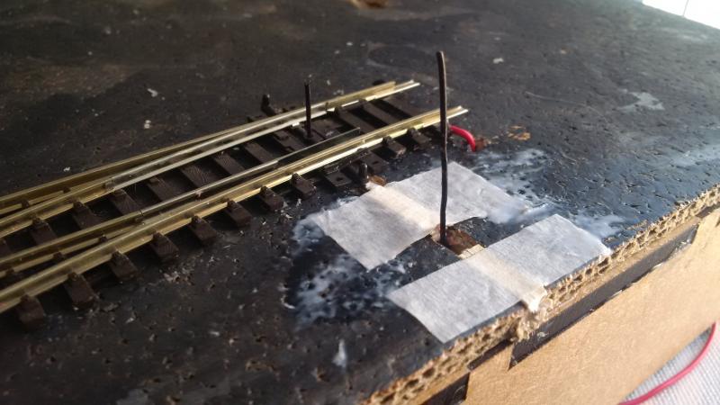 The first stage of the 'tube in groove' point control method. Basically the florist's wire is a very snug fit in the tube (from a very cheap plastic spray bottle) and a groove is cut into the cork/cardboard base. It then moves as a whole supported either side with braces, very quick and it works for me.You'll notice I'm not taking the rods to the edge as I know I will damage them as my board is constantly on the move, so I'm connecting the operating end to various movable features on the board to disguise them …or so I hope …