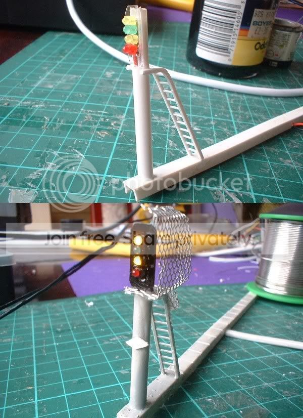 The next job now that they are working is to fix in place with some araldite provided that I manage to pick some up tomorrow! The signals operation has been tested using a coach fitted with a magnet and looks quite realistic changing to red as the coach passes the signal. Tomorrow I'm hoping to finish off the signal gantry that I started tonight. Just one final thought. I quite fancy having a go at building an automatic level crossing for the back of the layout. The only real problem would be getting the barriers to move outdoors. Anyone had any experience at building one of these on there indoor layouts?