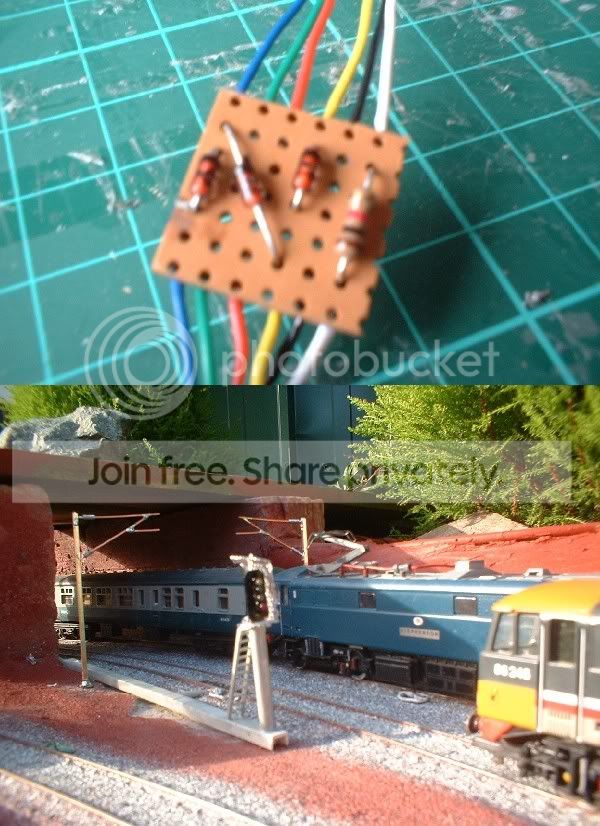 The red on the left is for the branch to Cobblers Hall. This line will be bi directional so should be fun wiring that one up! The green on the right is for the down main line. This signal is switched via the automatic station stop system that I built earler in the year. However as the system has only two outputs red/green I need to modify it to work the yellow aspect. Im going to wire it so that instead of showing red all the time it will now display yellow untill a train leaves the garage. On entering the wall section the train will trigger a latch that will change the yellow to red. The train will then approch the red signal as before at the end of the platform. The timer is then activated via a reed switch. This kills the track power for a pre set time. After about thirty seconds the timer changes the signal to green whilst also switching the power back on. The train then departs and resets the timer system that puts the signal back to red. I will be fitting another signal further down the line so I can use the reed switch for that signal to also reset the latch changing the red back to yellow. Sounds ok in theory just have to fit the extra switches and see if it works!