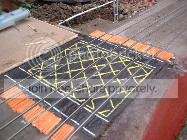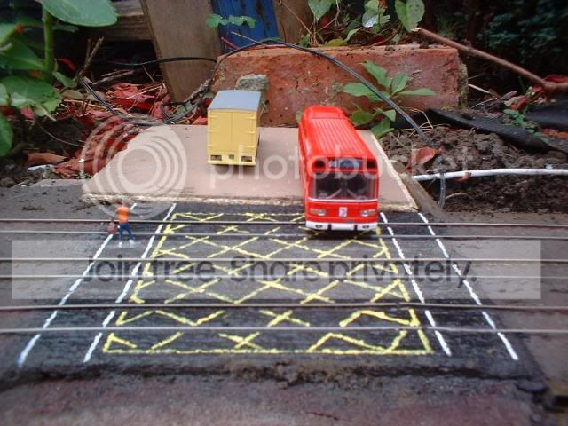 You will note in the pics that there are two brass tubes running side by side. The round one is for the barrier mechanism whilst the square one is for the cabling for the lights. Once the brass tubing had been fitted and the track replaced the roadway was then created using a mix of mortar. The replacement track on the down main was also set at the same time……..