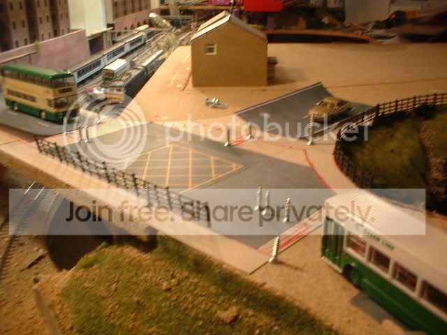 The base of the scenery was built up from polystyrene sheeting stuck together using my favourite stuff decoraters caulking. This stuff is great for sceneary building and is only £1 a tube from poundstreachers! The roadway was made from thick card stuck in place with the caulking and then painted with stone effect paint. The grass matting is stuck with…. caulking along with the bushes……..