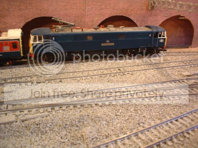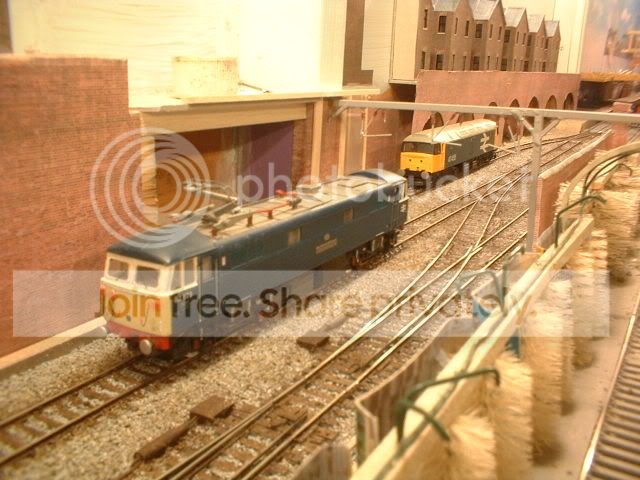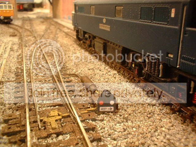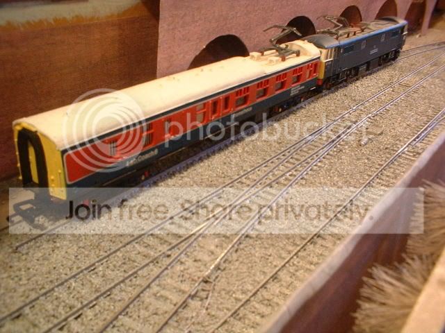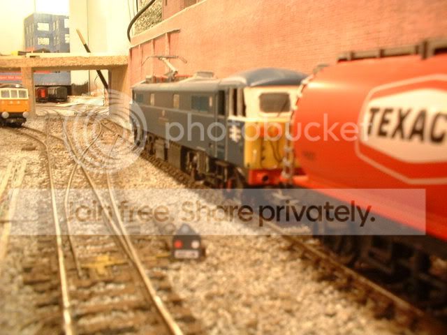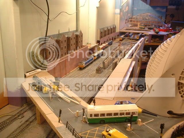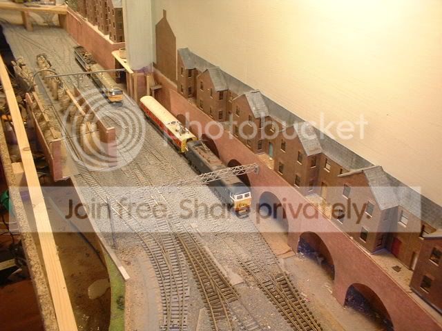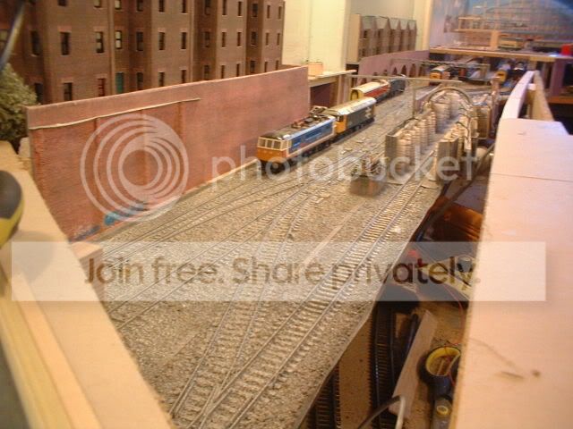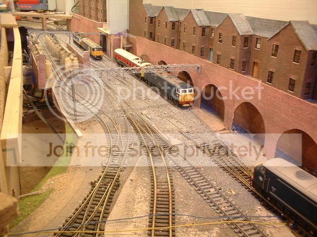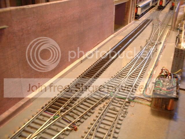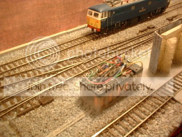 The two points on the left that form the crossover between the main line and the loop have had wiring added so that the points no longer provided any switching. Those working with DCC will understand as this is used to keep all the track live. Also worthy of mention here is the lower sidings just visable at the left. The scenic section that I have been working on fits to the left just out of shot whilst the traffic lights are located just off the bridge. Once the work on the electrics is finished attention will turn to the bridge itself and the embankment between the railway and the back of the houses/shops. ;-)