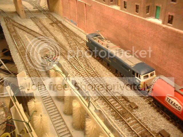This test train kept me amused for about half an hour last night just running from the buffer stops on platform 1 to the overbridge just before the canal area. The choice of loco is deliberat as it's got the longest wheelbase whilst the tanks have all been rewheeled with lower profile wheel sets so if anything will derail garanteed it will be them! This last shot shows the relays mounted in the space between the washing plant and the main line……