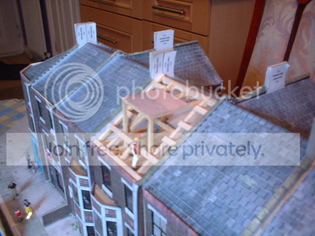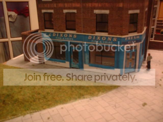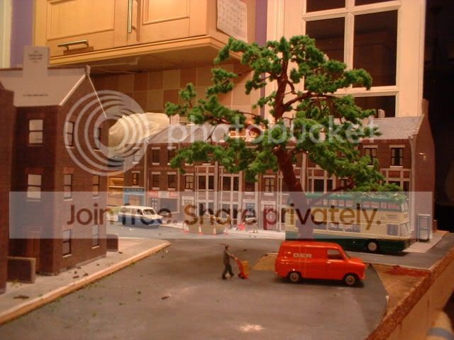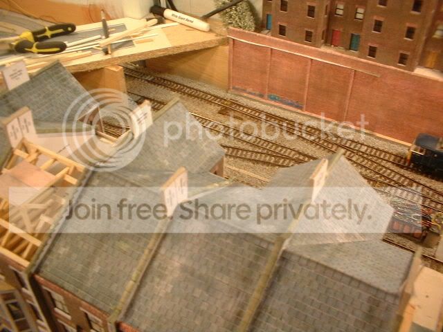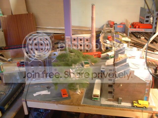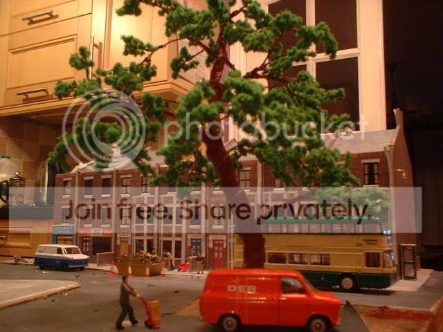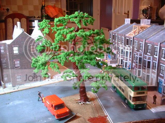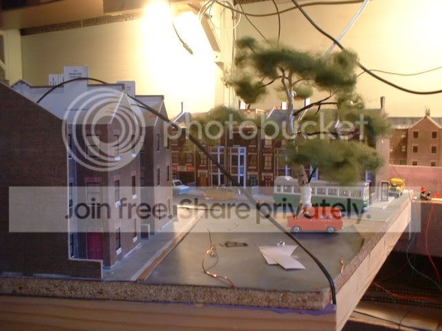 Now that I can 'see' more of the layout I can plan the scenery a bit better. I still need to finish off the houses/shops although I have managed to glue the backs on! At the back of the shops I decided that I needed somthing with a bit of height. So after seeing some trees being made at Darlington exhibition I decided to have a go. This is the result……..