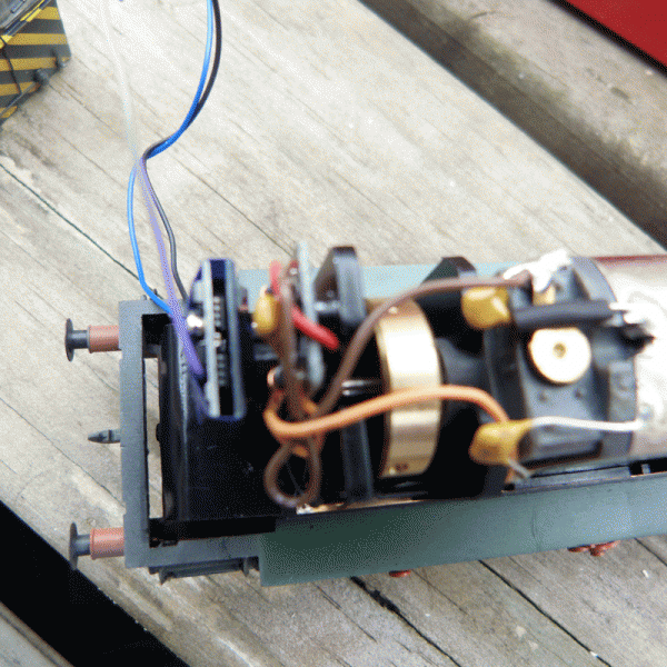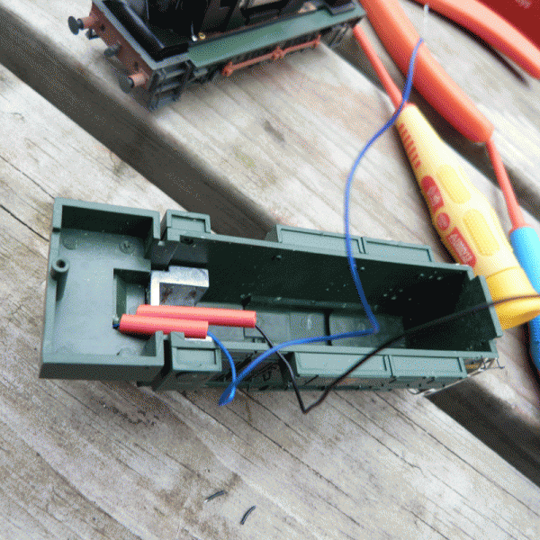 The body, once the screws are removed hinges to the front. you can see the long slot to the left of where I have fitted the decoder. The decoder itself is a direct push on type but has three cables coming out of it. One for an additional function and two that connect to their similarly coloured partners on the stay alive unit which you will see housed in the cab shortly.