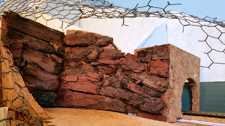 A view towards the engine shed, the quarry and the tunnel mouth. Bark is starting to be glued with PVA to the cork tile quarry wall behind the engine shed. Luckily the bark peels off in strips.