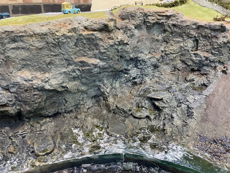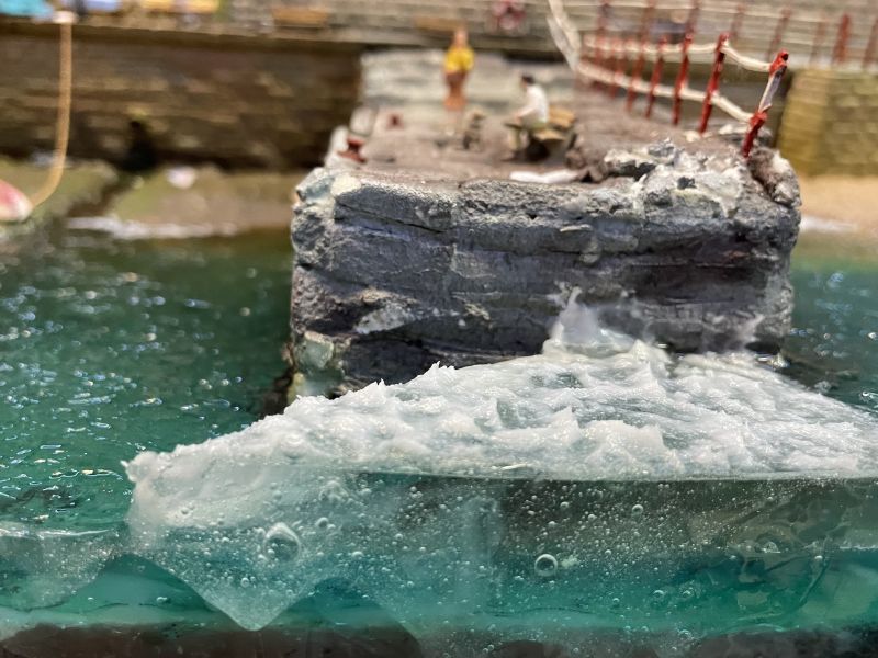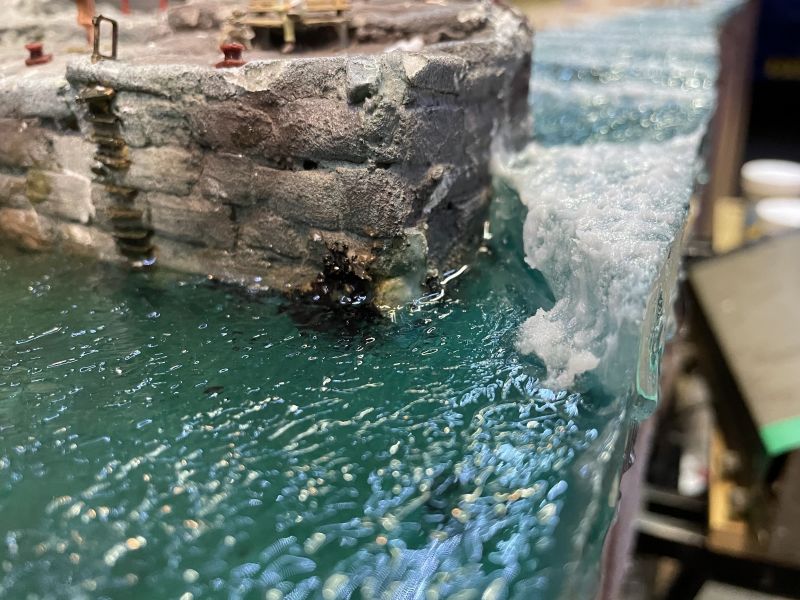 I also realised even though I tried to keep the scene level during construction, it wasn’t perfect. I also should have brought the whole harbour scene up by 3-4cm. So hidden at the end of the pier is a ‘mighty large’ step, which I have tried to hide as a wave.