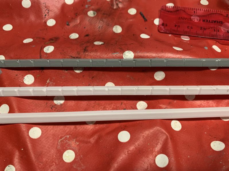Tonight’s job is filing coping stones into a plastic L bracket to hide the edging on the sea wall. Above are the various states up to the undercoat. I’ve filed my thumb a few times in the process!