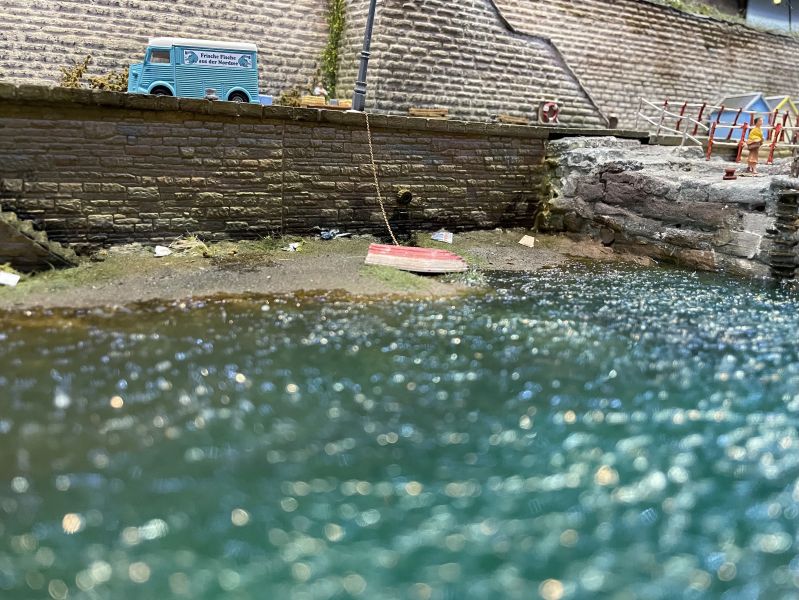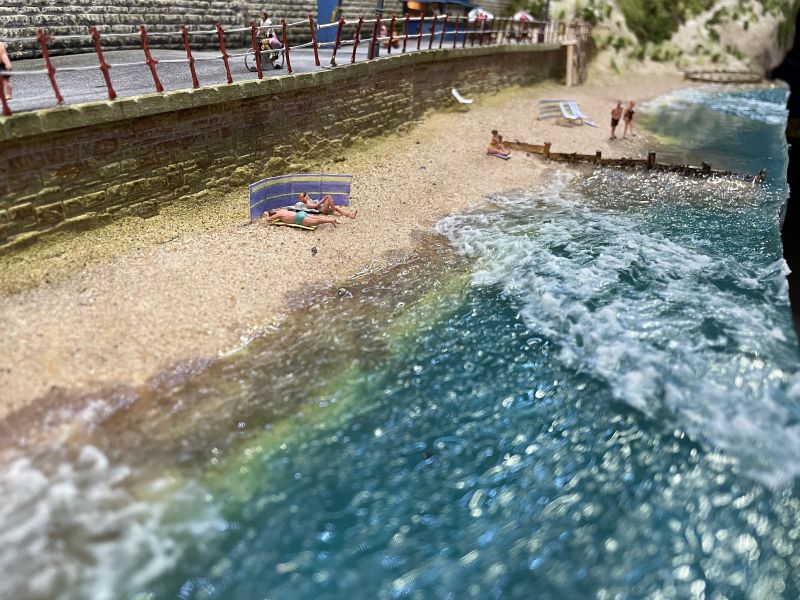 The ripples are using the Woodland Scenics water ripples product. Coating it on top of the resin and then gently playing with it as it dries to form ripples in the direction of the tide. You can still see through the layers as before but it now no longer looks like a frozen pond.