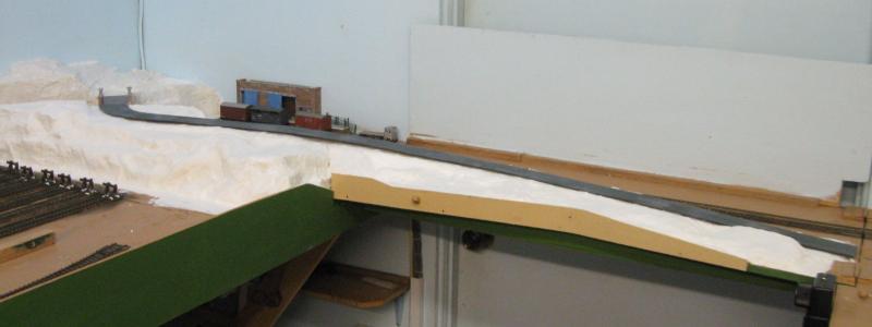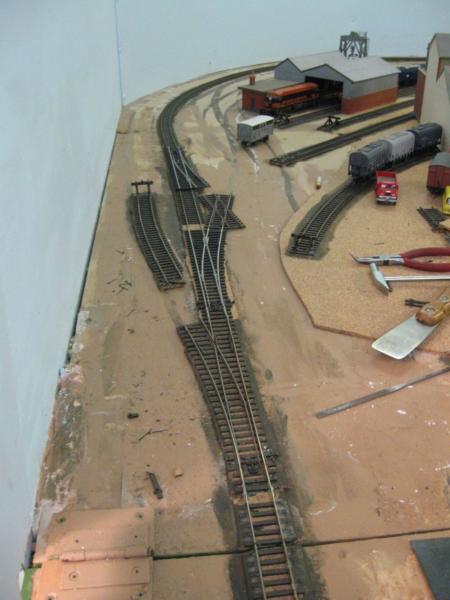 was another small siding kicking back into a cattle dock. The last operating session saw that this shunting manoeuvre create problems with main line running so it was decided to make both sidings non-operational but just a scenic area. DMU's will stop at the platform which is to be set onto the liftup. So while the points are made fixed, the time was taken to shift the point into the cattle siding closer to the liftup by 4" so that additional points can be installed for allowing Tawnton to be a through running station and also to be able to access the planned extension.