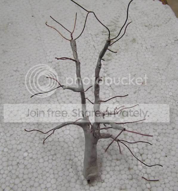 I grab about 8 strands of fairly fine copper wire and twist them into a 'cable'. Working upwards from the base I separate 2 or 3 strands and twist them into branches, trying to keep lowest branches thickest.