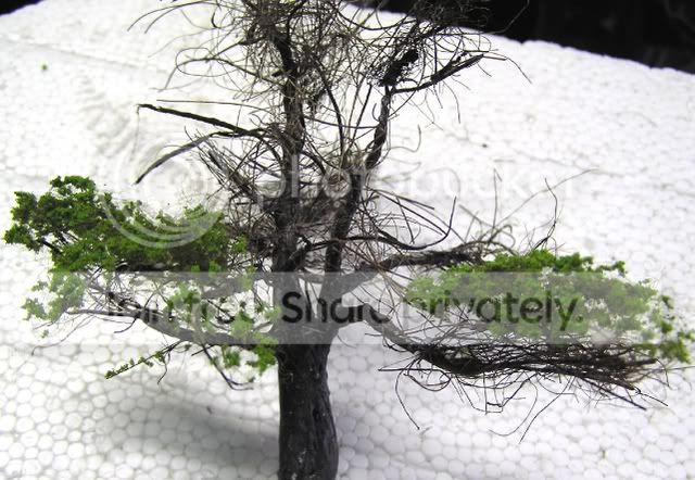 Tear the foliage mat into small pieces and test on the tree before glueing. I tried to add the foliage in layers, without being too regimented, and I left plenty of gaps.