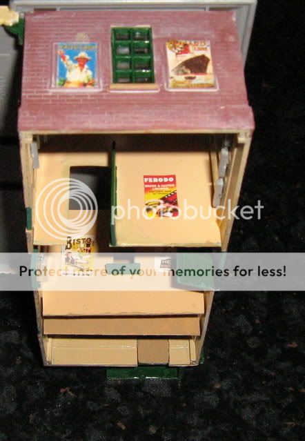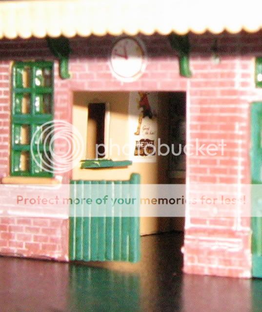 8. I then painted the interior of the building and the new walls a buff colour and the ticket office shelf and waiting room door green. I added a few posters and could have added other items of detail, but I stopped here.
