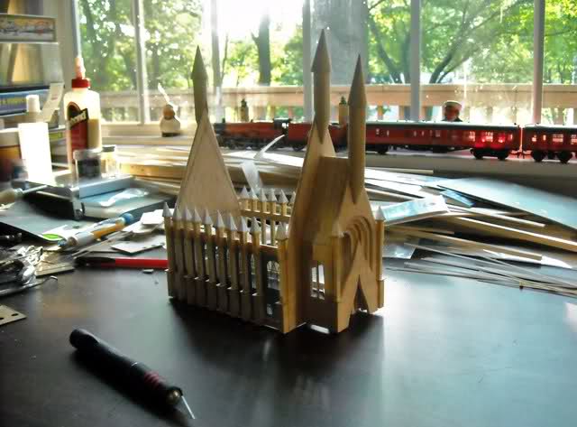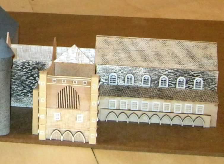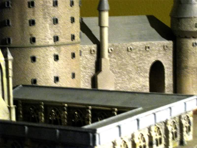 I made a single section of the stone courtyard in basswood and then made an RTV mold of it and cast lots of courtyard wall panels in casting resin. I did the same for the dormer windows.