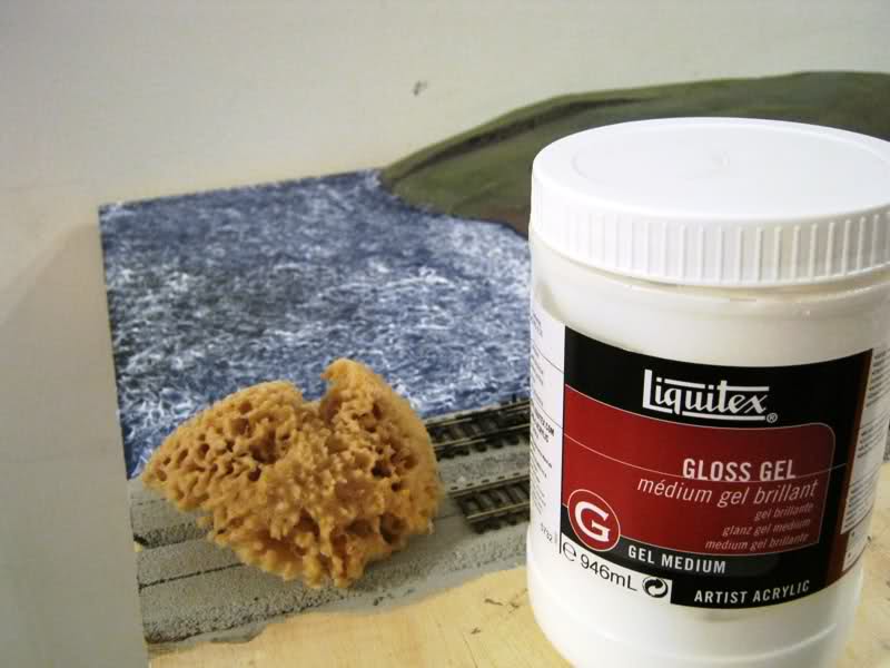Then I dabbed on Liquitex Gloss gel with a natural sponge to get wave crest shapes. It goes on white, but dries clear.