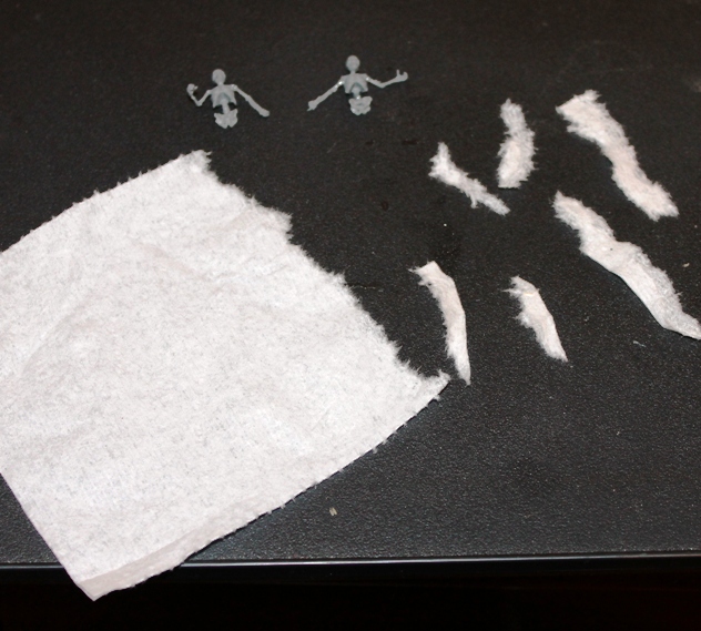 I put together heads, torsos and arms. I tried a number of different materials and found that regular bath tissue torn into strips and applied to the figures dampened with a water/white glue mix works best.